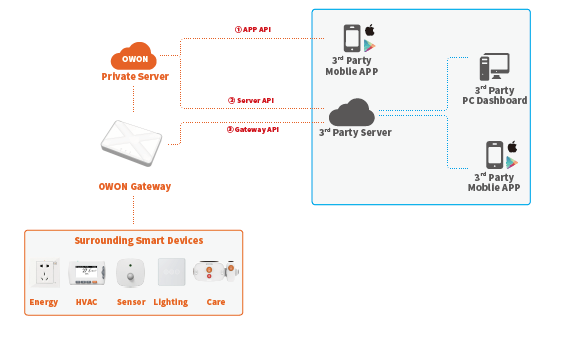 The Gateway offers open Server API (Application Programming Interface) and Gateway API to facilitate the flexible integration between the Gateway and the third party Cloud Server. The following is the schematic diagram of the integration: