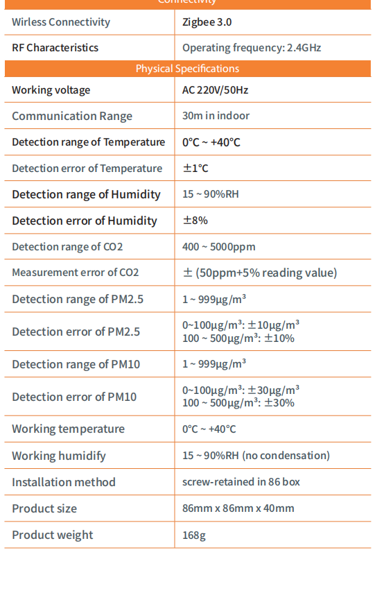 - Smart Linkage:Connects to Zigbee BMS for automated responses (e.g., triggering air purifiers when PM2.5 exceeds standards).